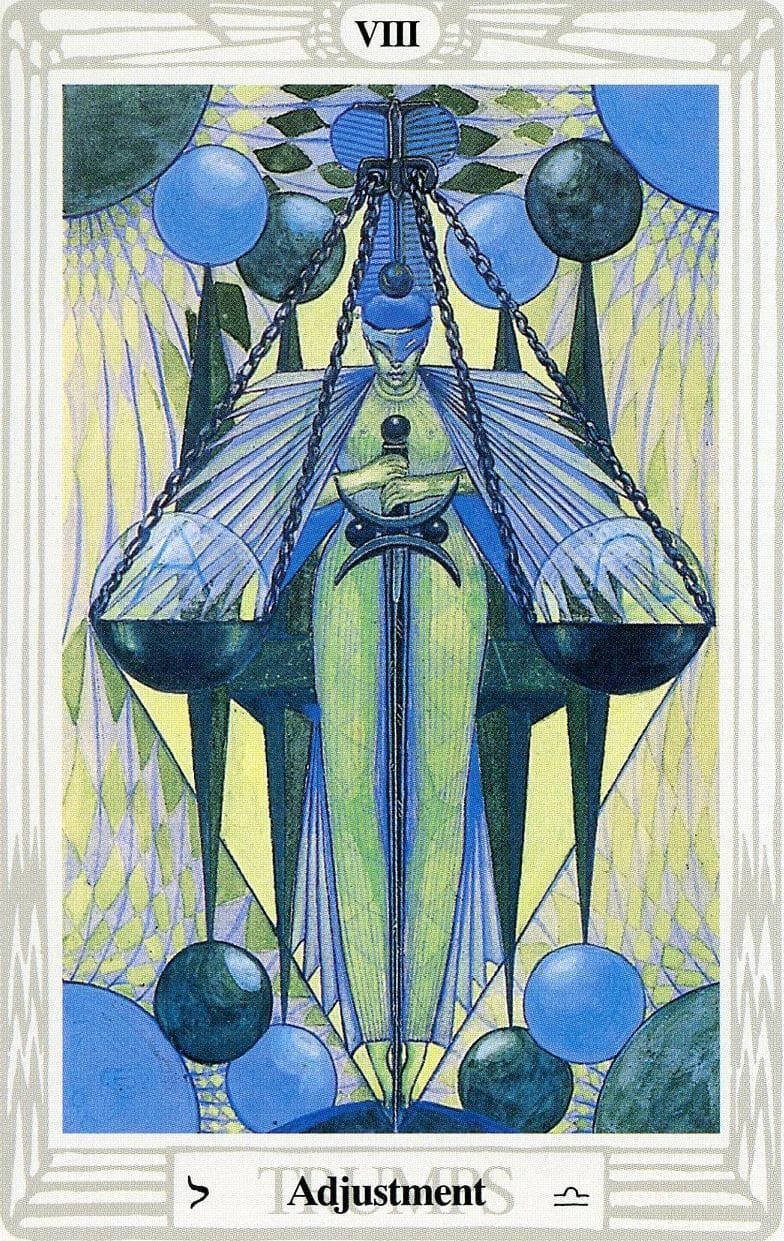 "In the Thoth deck, Adjustment is the embodiment of Libra itself, the scales of balance, truth, and cosmic order. The figure is poised in perfect equilibrium, holding the sword of discernment upright, reflecting the clarity and precision needed to cut through illusion. It’s about alignment with self, with universal law, with the harmony that arises when every part of us is in right proportion- the equality between opposites. Crowley called this the card of “constant motion yet perfect balance,” reminding us that balance is not static but a living, breathing act of continual adjustment."