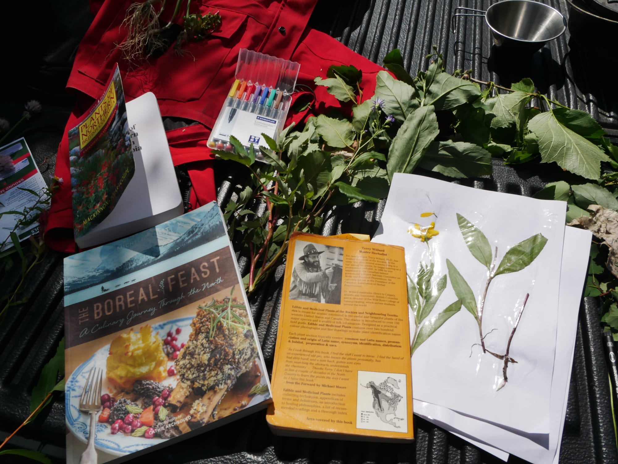 We identified a bunch of plants using both our own cultivated knowledge and also book referencing Terry Willards Edible & Medicinal Plants of the Rocky Mountains & Neighbouring Territories & Plant of Norther British Colombia expanded second edition by McKinnon, Polar & Coupe. Having no phone signal out in the bush means you can't fall back on apps that instantly ID the plant at the click of a picture through the internet.. It was actually so refreshing to just use the books & put our heads together even if we were unsure what something was and couldn't ID it immediately. Searching organically through what we did already know, or could literally see or read & narrowing things down by cross referencing with other plants we thought they might be.. Moving in this slightly more devotional way felt healthy for both brain & plant practice. To really get to know the plant by taking in the shape or feel of their leaves, counting flower heads/petals & colour of berries for example. Really studying them..the connection feels deeper, more intentional & with a higher chance of learning & understanding who they are by heart not just memory- which often feels short lived & shallow anyway.